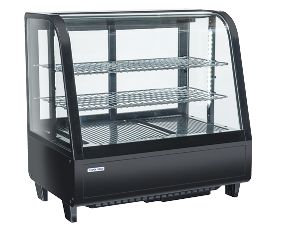 En kølemontre i sort, udstyret med LED-lys og et dobbeltbuet anti-kondensglas og designet til eksponering af enhver form for mad, der fortjener en fremtrædende plads på salgsdisken.