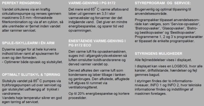 Korteste program 50 sek., opvaskeydelse: 1.296 tallerkener/h – afhængig af vandtilløbstemperatur / eltilslutning