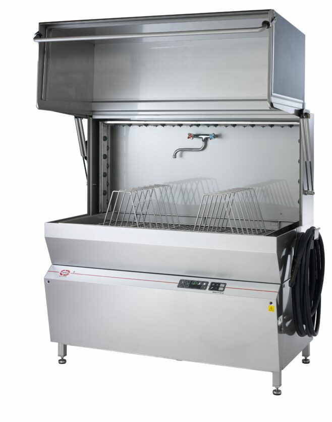 Denne grovppvasker fra Jeros har et integreret rengøringsprogram, hvor vaskepumpen bliver aktiveret og maskinen tømmes automatisk samtidig med, at dyserne gør maskinen ren.