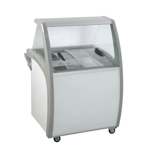 Den buede glasfront sikrer god hygiejne og et eksklusivt udtryk, mens de glidende glaslåg med lås giver nem betjening og sikker opbevaring. Disken leveres med 4 stk. 5L Napoli-iskantiner i rustfrit stål samt praktisk opbevaringsplads bagtil til ekstra kantiner.