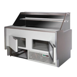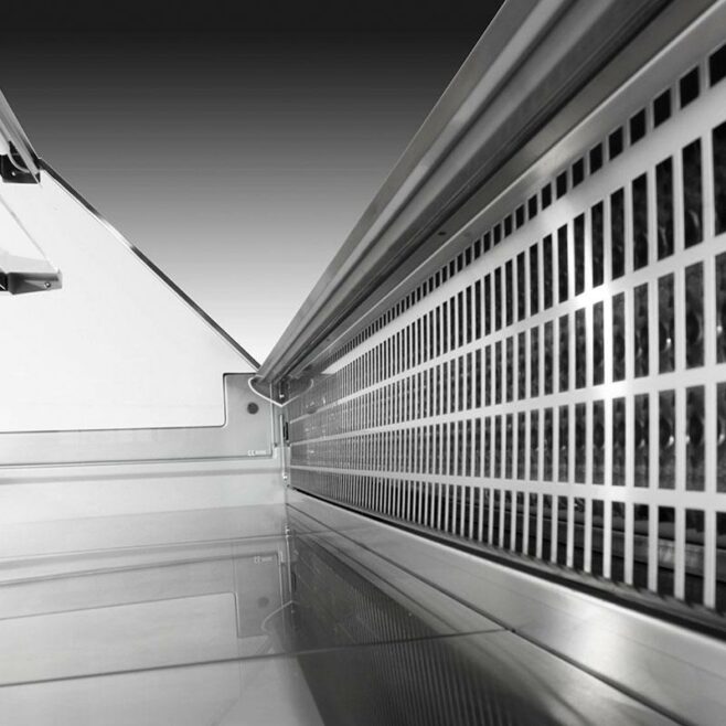 Arbejdsplade i rustfrit stål med bundkanal, der passer til bageste plexiglasskydedøre (valgfrit).