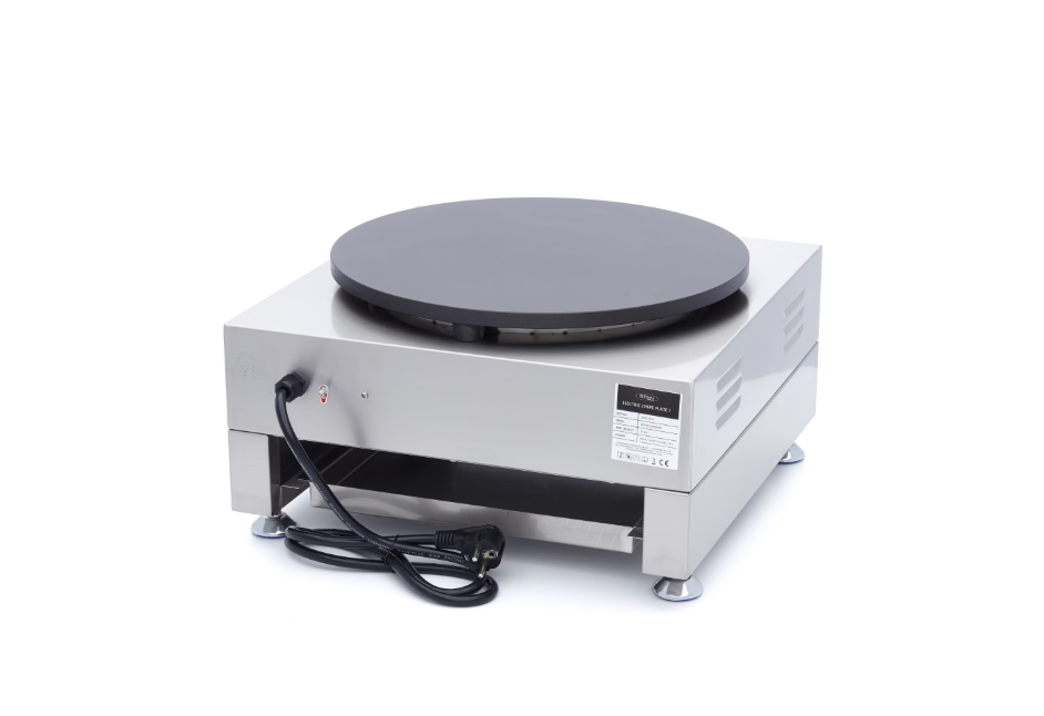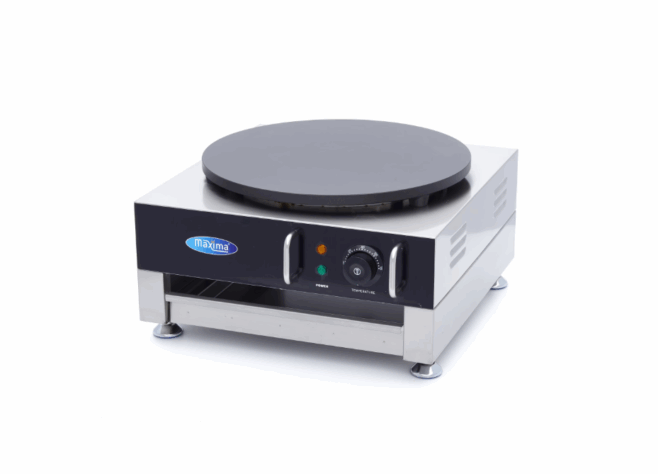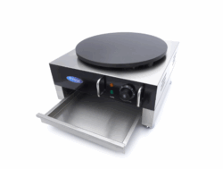 På denne enkelte elektriske crepemaskine kan du lave de lækreste crepes, tynde franske pandekager. Friske hjemmelavede crepes er ideelle til morgenmad, frokost, dessert eller som en nem snack. Den kompakte størrelse sikrer, at du kan bruge crepemaskinen ikke kun i dit cateringkøkken, men også i en kagebod, foodtruck eller ved en markedsbod under events. Der er en opbevaringsskuffe under crepe-bagepladen, hvor du kan opbevare de crepes, du har lavet. Bagepladen har optimal varmeoverførsel til hurtig produktion af store portioner crepes.