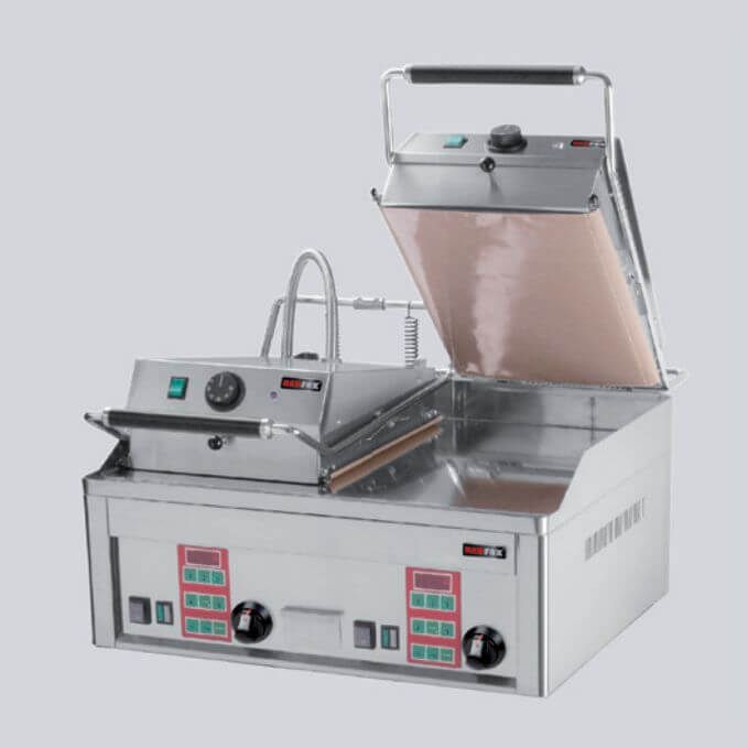 Turbosteger fra RM Gastro – double – 3 stegeprogrammer, manuel løftefunktion, non-stick overflade, seperat indstilling af nedre og øvre stegeplade, selv regulerende øvre plade og timer med alarm. perfekt til det travle køkken.