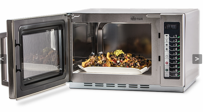 Mikroovnen har plads til fade, der måler 356 mm, og den opvarmer store portioner på ingen tid.