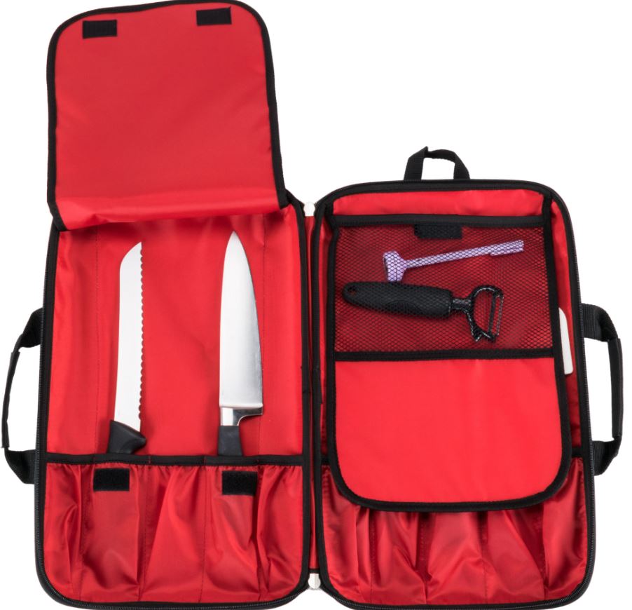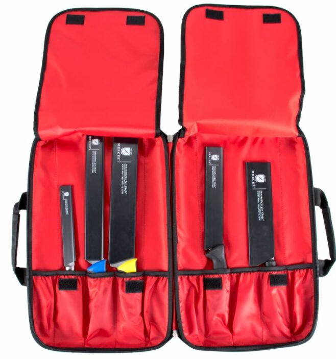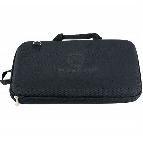 Mercer knivtaske med 11 pladser. Åbnes let med lynlås, og præsenterer knivsamlingen, så man kan vælge lige den kniv man har brug for. Indeholder en holder til visitkort.