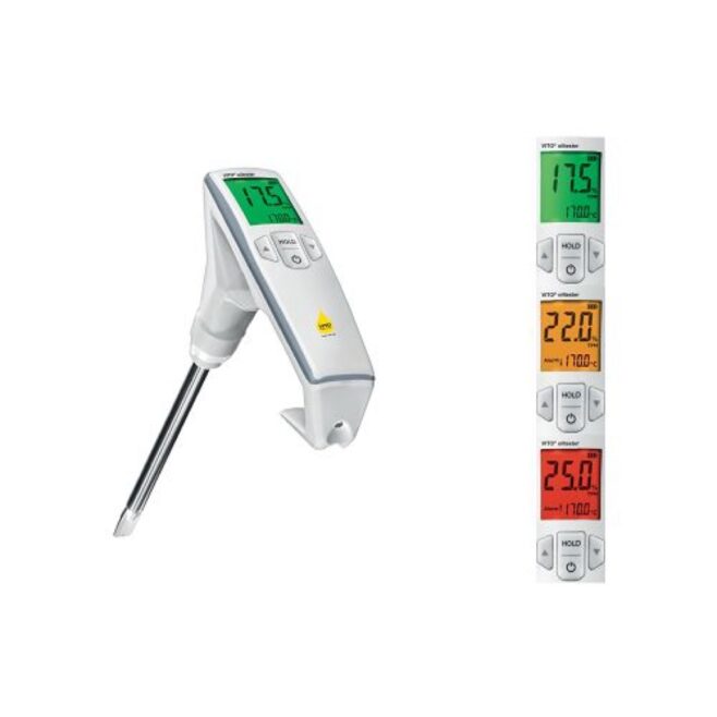 VITO olietesteren bestemmer nemt, hurtigt og pålideligt kvaliteten af din olie. For at gøre dette måler den det såkaldte “Total Polar Material” (TPM) indhold i olien og viser dens værdi som en nøjagtig procentdel. Den klare alarm via det farvede topalarmlys gør det endnu nemmere at vurdere kvaliteten af olien. Så du ved altid præcis, hvornår du skal skifte din olie. VITO oiltester fritureolietester forhindrer direkte eksponering af din hånd for den varme olie.