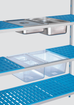 Mulighed for at anvende gastronormbakker direkte i reolsystemet (2/3 gn ved 385 mm dybde)